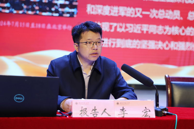李宏指出,党的二十届三中全会是党中央在以中国式现代化全面推进强国建设、民族复兴伟业的关键时期召开的一次十分重要的会议。全会审议通过的《决定》,谋的是强国复兴伟业,布的是推进中国式现代化大局,立的是党长期执政、国家长治久安之基,是站在新的历史起点上推动全面深化改革向广度和深度进军的总动员、总部署,是指引新征程改革开放事业的纲领性文件。全校上下要坚持学深悟透,深刻领悟全会的核心要义和精神实质,深刻认识到进一步全面深化改革任务重、责任大,切实把思想和行动统一到习近平总书记重要讲话精神上来,不折不扣贯彻党中央改革决策部署。